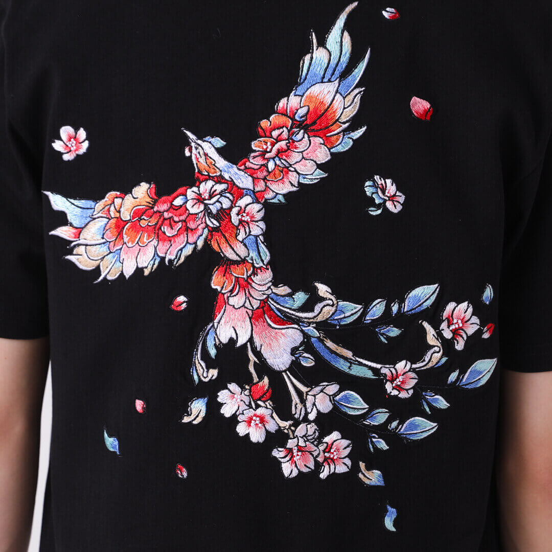 Made from 100% cotton, Kidoriman's Phoenix Shirt boasts a soft texture that makes it comfortable to wear. Featuring a colorful Phoenix bird embroidery on the back, this shirt adds a bold and unique touch to any outfit.